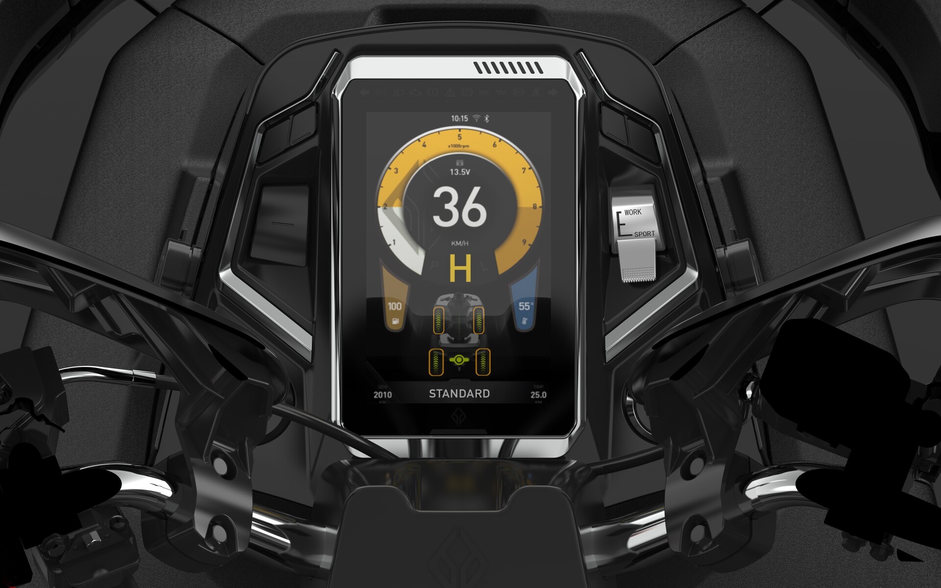 Veľký farebný TFT displej, kryty rukovätí aj riadidiel pre vyššiu ochranu, stredová radiaca páka a uzamykateľné radenie prevodovky zaisťujú komfortné a bezpečné ovládanie.