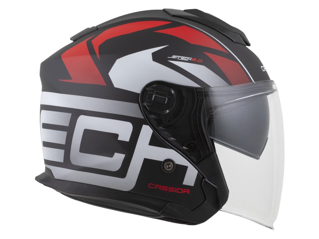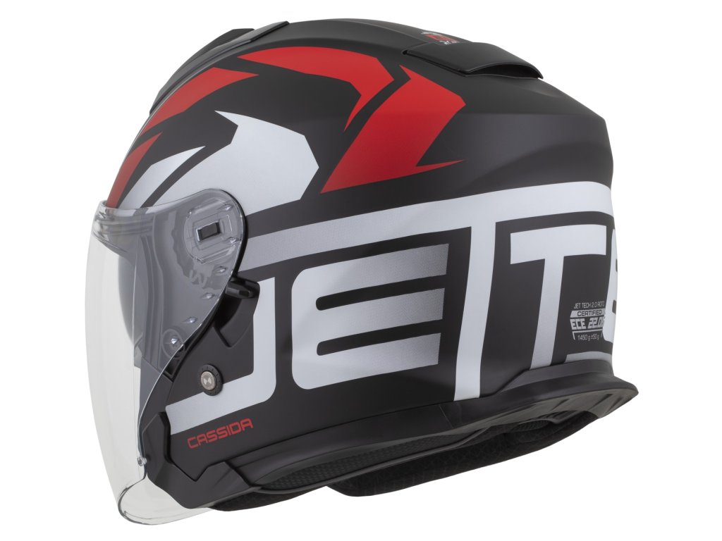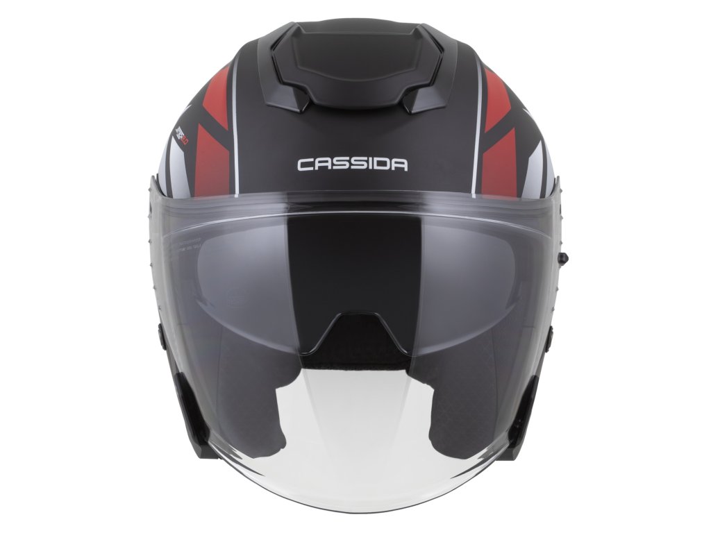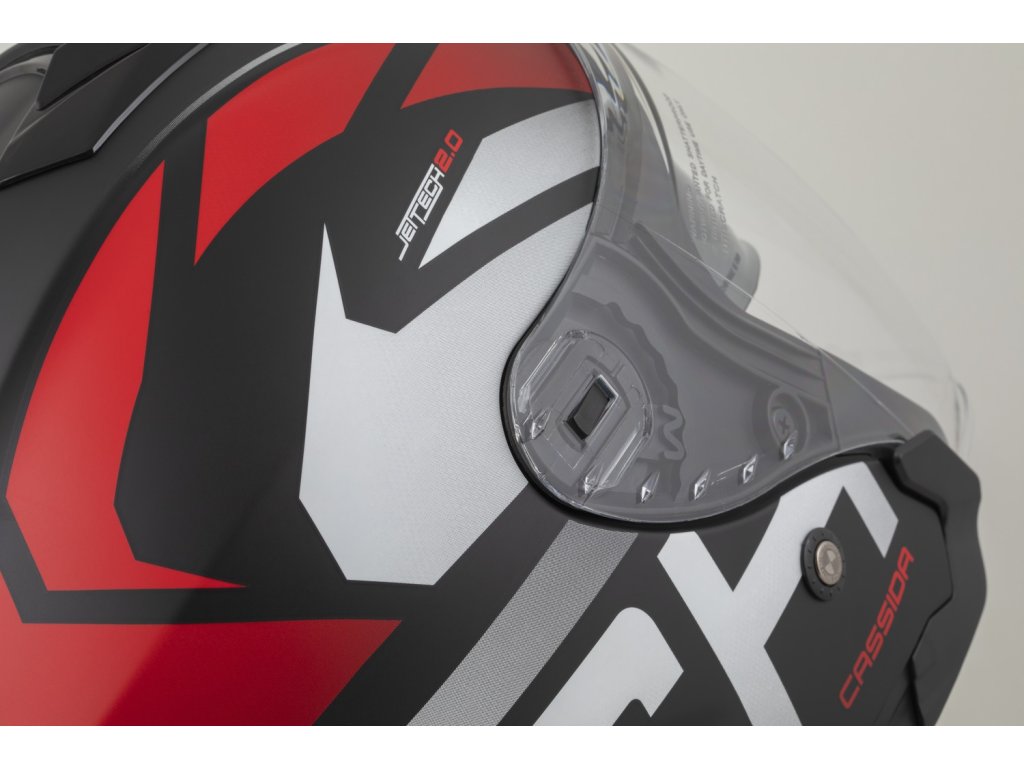 Motocyklová prilba Cassida, ktorá ponúka vylepšený dizajn a pohodlie vďaka plastovej škrupine a dlhému plexi s úpravou proti zahmlievaniu.